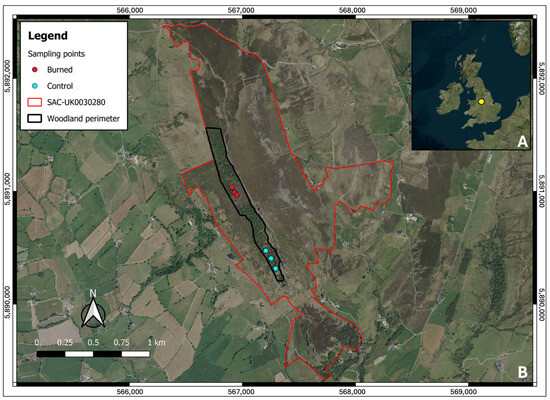 The study was carried out in a forested area of central England, located within The Roaches Nature Reserve (UTM 30U 566,962.40 m E, 5,890,975.00 m N) (Figure 1A). This area is part of the wider Peak District National Park and has also been designated a Special Area of Conservation (SAC—UK0030280) (Figure 1B). The study area includes two ecologically distinct habitats, separated by a rocky ridge. On one side, there is a mixed woodland dominated by Pinus sylvestris L. (Scots pine) and Larix decidua Mill. (European larch). On the other side, there is an open peatland, mainly populated by species from the Ericaceae family [41,42]. The climate in this area is typical of a temperate, humid region, with abundant rainfall throughout the year and moderate temperatures, without a clearly defined dry season. According to climate data from the ERA5-Land database for the period 1950–2023, the area’s average annual rainfall is approximately 990 mm, while the average annual temperature is around 8.4 °C. In 2018, a wildfire ignited by a barbecue within the woodland burned approximately 60 hectares of vegetation, affecting also the surrounding peatland.