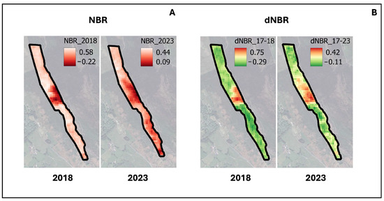 (A) NBR after the fire event in 2018 and five-years post-fire in 2023, (B) dNBR immediately after fire in 2018 and five years after the event in 2023.