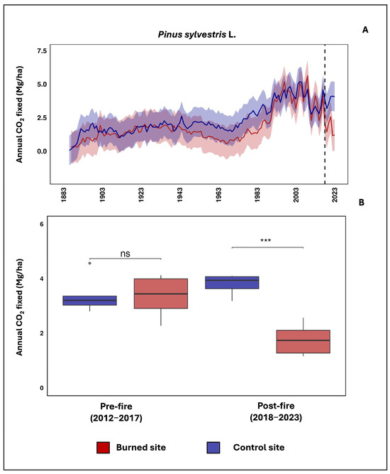 (A) Annual trend of CO2 fixed by P. sylvestris trees, with relative standard deviation shown as shaded bands. The black dashed line indicates the year of the fire (2018); (B) Statistical comparison between pre-fire (2012–2017) and post-fire (2018–2023) periods in the burned area (red) and the control area (blue), with relative standard deviation indicated by black error bars, grey dot represents an outlier, ns = not significant and *** = p < 0.001.