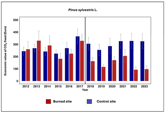 Economic values of the CO2 absorption ecosystem service in the pre-fire (2012–2017) and post-fire (2018–2023) periods for P. sylvestris trees in the burned (red) and control (blue) area. Gray bars indicate the standard error.