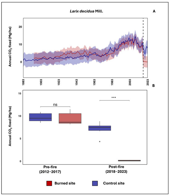 (A) Annual trend of CO2 fixed by L. decidua trees, with relative standard deviation shown as shaded bands. The black dashed line indicates the year of the fire (2018); (B) Statistical comparison between pre-fire (2012–2017) and post-fire (2018–2023) periods in the burned area (red) and the control area (blue), with relative standard deviation indicated by black error bars, grey dot represents an outlier, ns = not significant and *** = p < 0.001.