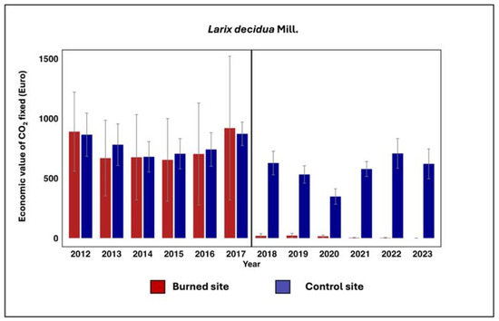 Economic values of the CO2 absorption ecosystem service in the pre-fire (2012–2017) and post-fire (2018–2023) periods for L. decidua trees in the burned (red) and control (blue) areas. Gray bars indicate the standard error.