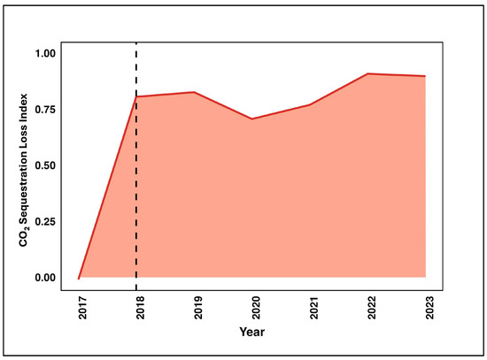 To assess the functional impact of the wildfire, a novel CO2 Sequestration Loss (CSL) index has been employed, designed to quantify the relative reduction in this ecosystem service. The index is based on ratio between the annual sum (year t) of CO2 adsorbed by the two species in each area (Equation (9)). The calculation included the year preceding the fire (2017) and the post-fire period (2018–2023). The control stand was chosen as the reference because it represents the best local performance of CO2 sequestration in the absence of disturbance, thus allowing us to express the functional loss in the burned area as a relative measure against this baseline.