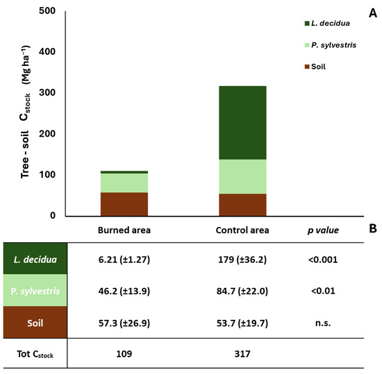 The distribution of carbon among compartments (Figure 8B) indicated that this reduction was primarily attributable to the mortality of L. decidua trees. Meanwhile, soil carbon stock remained essentially unchanged, and no statistically significant differences were detected between the burned and control areas.