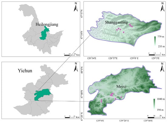 The study area is located in Yichun City [], Heilongjiang Province, China (127°37′~130°46′ E, 46°24′~49°24′ N). The region has a northern temperate continental monsoon climate, with a mean annual temperature of 1.0~1.2 °C, annual accumulated temperature of 1700~2200 °C, a frost-free period of 87~120 days, and annual precipitation ranging from 750 to 820 mm, most of which falls between June and August. The dominant soil types are dark brown forest soil, meadow soil, and marsh soil, with humus content ranging from 6% to 8%, pH values between 5.0 and 5.5, and an average soil depth of up to 70 cm. The topography is generally higher in the northwest and lower in the southeast, with elevations ranging from 400 to 800 m and a maximum elevation of 1429 m []. The location of the study area is shown in Figure 1. Dominant tree species include Pinus koraiensis, L. gmelinii, Picea asperata, Abies fabri, Populus davidiana, Betula platyphylla, Juglans mandshurica, and Fraxinus mandshurica. Natural secondary forests and conifer plantations are widely and extensively distributed throughout the area [].