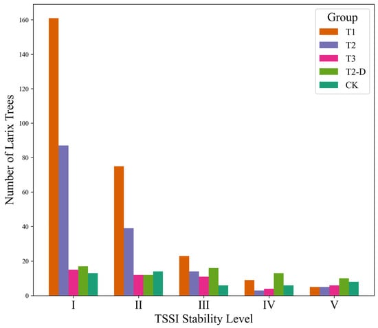 Distribution of L. gmelinii trees across TSSI stability levels in different groups.