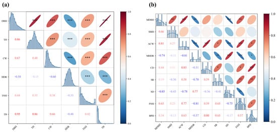 Correlation analysis results across different spatial scales: (a) correlation analysis among tree-level factors, showing frequency distributions (diagonal panels), pairwise correlation coefficients with significance levels (lower-left panels), and scatterplots with fitted ellipses (upper-right panels); (b) correlation analysis among stand-level factors, with the same layout, where color intensity indicates the strength and direction of correlation. Asterisks indicate significance levels (* p < 0.05, ** p < 0.01, *** p < 0.001).