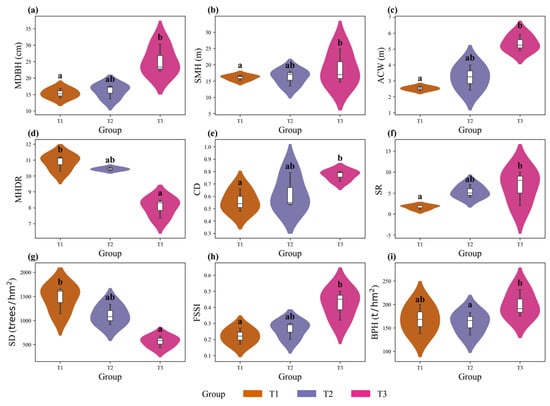 Structural and functional variations in stands across T1, T2, and T3. Panels (a–i) show the distributions of MDBH, SMH, ACW, MHDR, CD, SR, SD, FSSI, and BPH, respectively. Different lowercase letters above the violin plots (a, ab, b) indicate significant differences among groups at p < 0.05 based on Tukey’s HSD test. Groups labeled with the same letter (e.g., a and ab) are not significantly different, while those labeled with different letters (e.g., a vs. b) differ significantly. The intermediate label ab means that this group does not differ significantly from either group a or b.