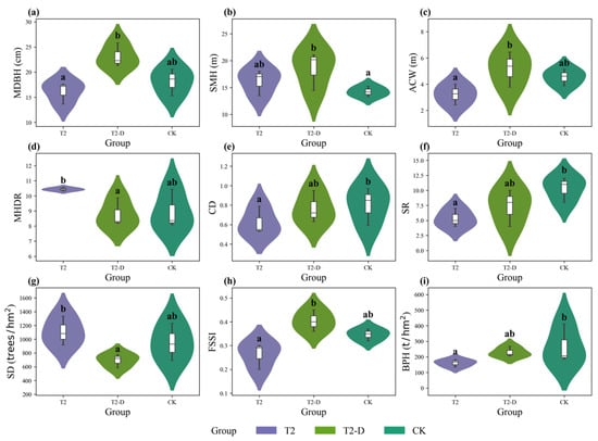 Structural and functional variations in stands across T2, T2-D, and CK. Panels (a–i) show the distributions of MDBH, SMH, ACW, MHDR, CD, SR, SD, FSSI, and BPH, respectively. Different lowercase letters above the violin plots (a, ab, b) indicate significant differences among groups at p < 0.05 based on Tukey’s HSD test. Groups labeled with the same letter (e.g., a and ab) are not significantly different, while those labeled with different letters (e.g., a vs. b) differ significantly. The intermediate label ab means that this group does not differ significantly from either group a or b.
