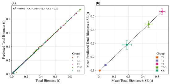 To quantitatively evaluate the effects of tree structural attributes on individual tree biomass (TB) and enhance the accuracy of productivity estimation, a Generalized Additive Model (GAM) was employed to establish a nonlinear predictive framework. Five structural variables were selected as explanatory factors, including DBH, TH, CW, HDR, and TSSI, with TB as the response variable. Based on this framework, a Larch Biomass Prediction model based on GAM (LBP-GAM) was constructed. The mathematical formulation of the model is as follows: