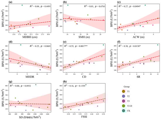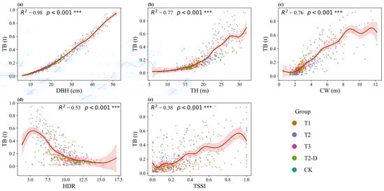 The results of this study indicate that multidimensional structural factors at both tree and stand scales exert significant regulatory effects on productivity, with distinct pathways operating at different levels. At the individual scale, Figure 3 shows significant correlations between DBH, TH, CW, HDR, TSSI, and TB (p < 0.001). Similarly, Figure 7 demonstrates significant nonlinear relationships between these five factors and TB (p < 0.001, 0.38 ≤ R2 ≤ 0.98), confirming that multidimensional structural factors jointly regulate tree growth potential. Among them, DBH provided the best fit with TB (R2 = 0.98), and its response curve exhibited a typical J-shaped pattern. When DBH was less than 25 cm, TB increased slowly, suggesting that individual growth potential was not yet fully released. Once DBH exceeded 25 cm, TB rose sharply, entering a phase of accelerated biomass accumulation, indicating that 25 cm may represent a critical threshold for structural regulation and productivity release. TH and CW ranked second, with R2 values of 0.77 and 0.76, respectively, and both showed continuous positive correlations with TB, reflecting the direct promoting effects of tree height growth and crown expansion on productivity []. HDR was negatively correlated with TB (R2 = 0.53), and TB declined sharply once HDR exceeded 10, implying that excessively slender stems weakened individual stability and resource accumulation, and should be avoided in structural management []. TSSI showed a relatively lower fit (R2 = 0.38), but its response curve rose steeply once TSSI exceeded 0.25, indicating that improvements in structural stability significantly enhanced its marginal contribution to productivity []. Consistent with the distributions in Figure 5, T1 and T2 individuals clustered in regions with HDR > 10, TSSI < 0.25, and relatively low DBH and CW, indicating underused TB growth potential. By contrast, T2-D, T3, and CK individuals clustered where HDR < 10 and TSSI > 0.25, reflecting more favorable structure and higher TB. At the stand scale, MDBH, ACW, CD, and SR were significantly and positively correlated with FSSI and BPH (p < 0.05), whereas MHDR and SD were the principal negative factors (Figure 3b). OLS and RDA consistently identified CD, SR, and MDBH as the main drivers of stand functions, with MHDR and SD constraining stability and productivity. In particular, Figure 8 CD showed the strongest relationship with BPH (R2 = 0.55, p < 0.01) [], while SR and ACW were also positive and significant (R2 = 0.38 and 0.27, p < 0.01), indicating the benefits of diversity and crown expansion []. MHDR was negatively related to BPH and was nearly significant, whereas MDBH, SMH, SD, and FSSI each had R2 < 0.2 and were not significant. Spatial patterns in Figure 9 corroborate these results: T2-D, T3, and CK cluster on the right, aligned with CD and SR, indicating higher structural quality and function; T1 lies mainly in the lower left, reflecting structural homogeneity and weaker function. The position of T2-D near the advantageous zone underscores the role of moderate thinning in optimizing structure and enhancing both stability and productivity.