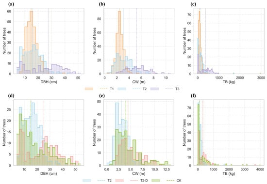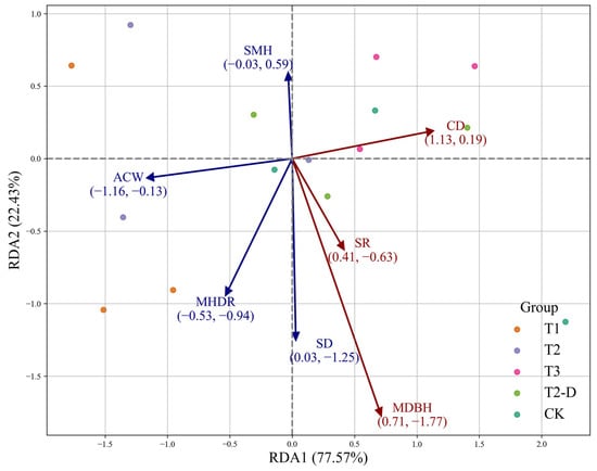 Furthermore, following the methods described in Section 2.3.2 and Section 2.3.4, structural and functional parameters, including MDBH, SMH, ACW, MHDR, SD, CD, SR, and BPH, were calculated and summarized for each stand group. Their means and standard deviations are reported, with descriptive statistics provided in Table 3. Along the T1–T3 gradient, most stand-level positive indicators exhibited an overall increasing trend, while MHDR and SD declined. Notably, BPH decreased in T2 but reached a relatively high level in T3. Overall comparisons indicated that the T1 group had the lowest MDBH, SMH, ACW, CD, and SR with values of 15.32 cm, 16.09 m, 2.53 m, 0.56, and 1.6, respectively, while showing the highest MHDR and SD with values of 10.87 and 1465 trees·hm−2, respectively. However, most indicators in T1 fluctuated within a relatively narrow range. Further comparison of T2, T2-D, and CK revealed that T2-D exhibited the most favorable MDBH, SMH, ACW, and MHDR with values of 23.12 cm, 18.57 m, 5.20 m, and 8.78, respectively. Its CD, SR, SD, and BPH were close to those of CK, though SMH, ACW, and SR showed larger variation. The CK group had the highest SR and BPH with values of 10.33 and 267.58 t·hm−2, respectively, but with significant within-group differences.