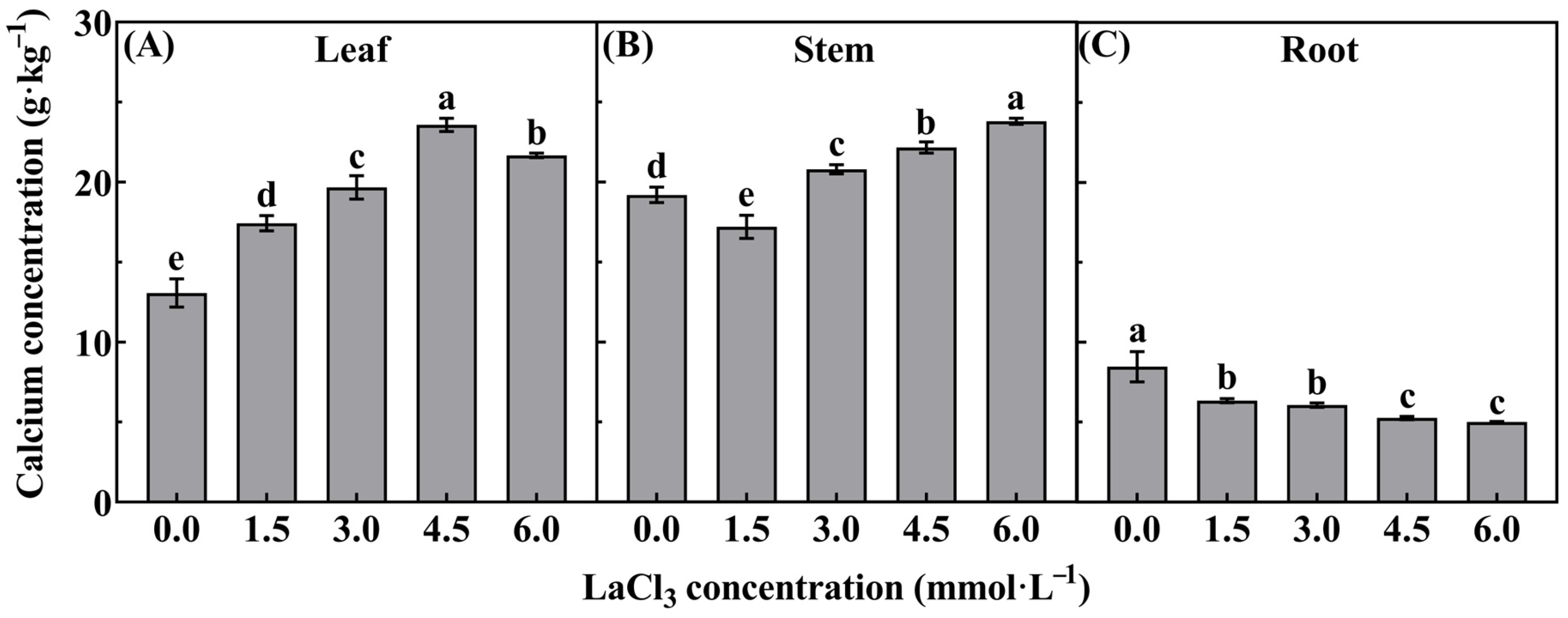 3.2. Effect of LaCl3 on the Calcium Concentration in Different Organs of Quercus acutissima Seedlings