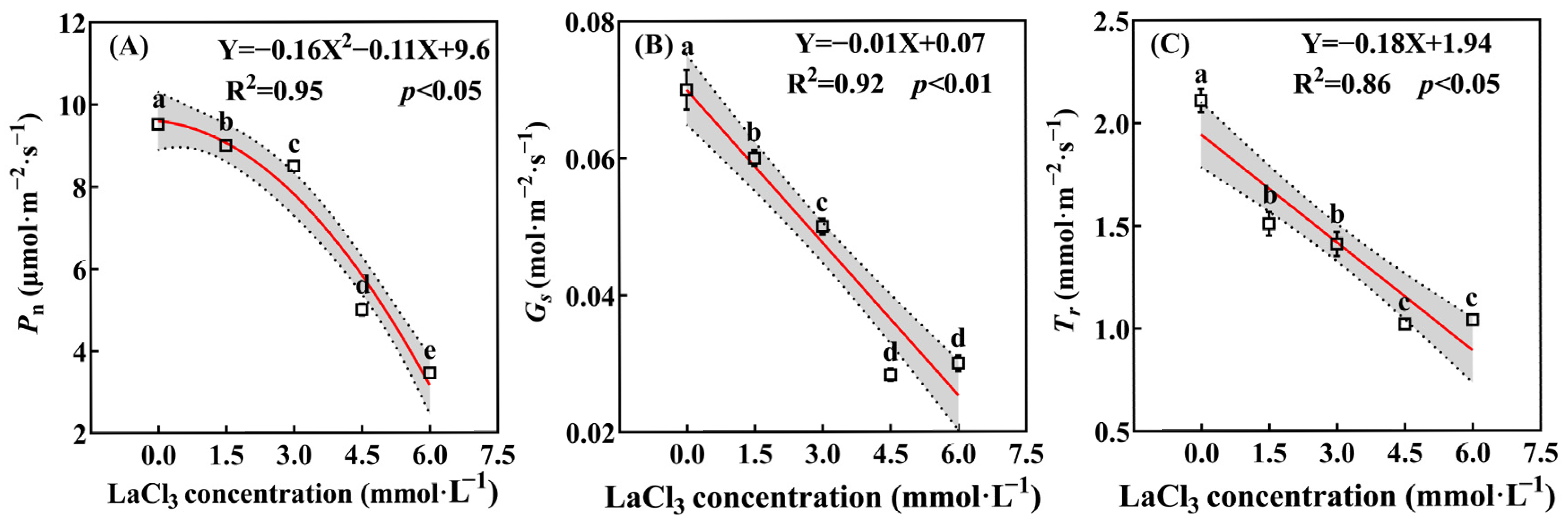 3.3. Effect of LaCl3 on the Photosynthetic Characteristics of Quercus acutissima Seedlings