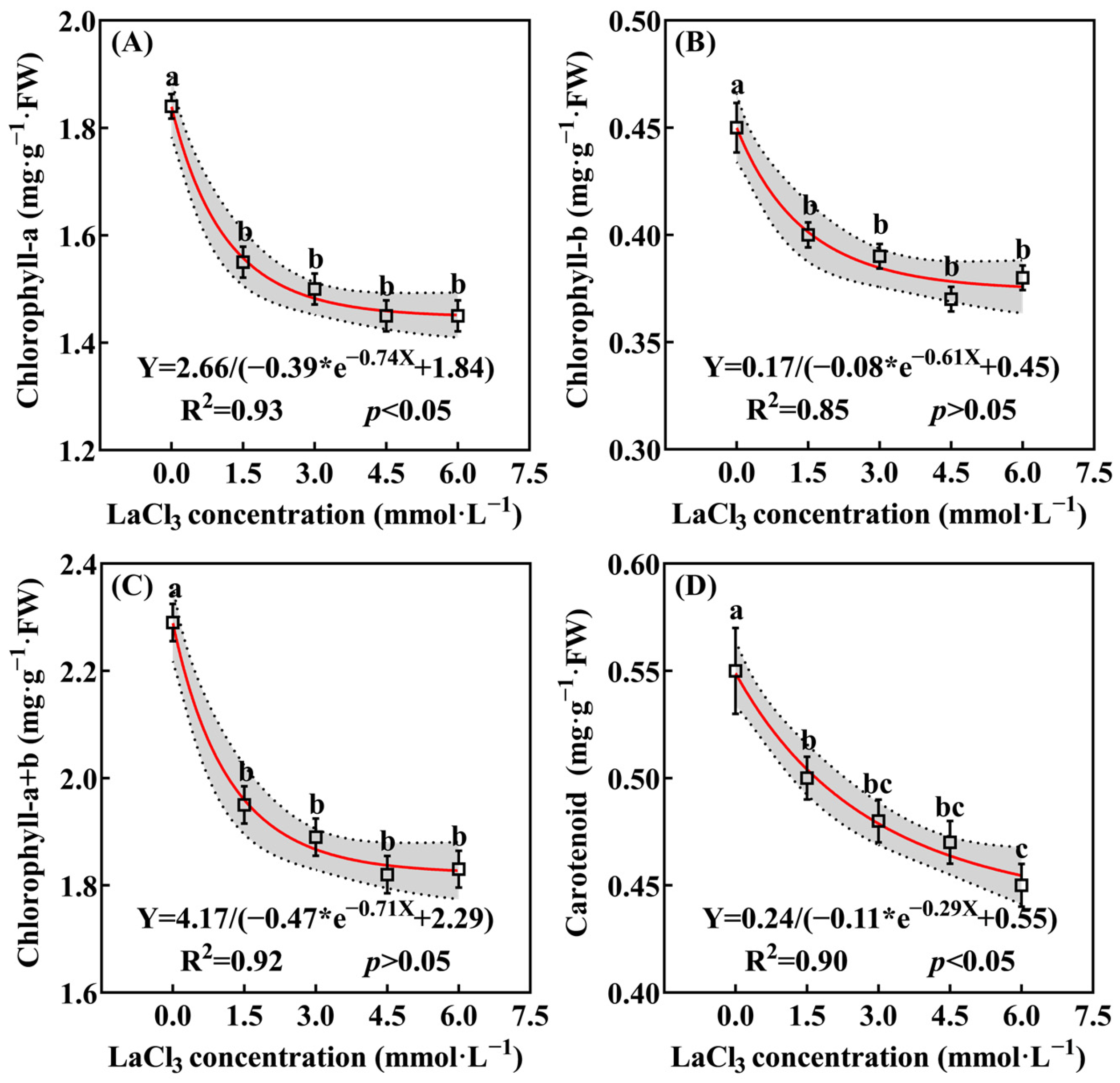 3.3.2. Effect of LaCl3 on the Photosynthetic Pigments’ Accumulation in Quercus acutissima Seedlings