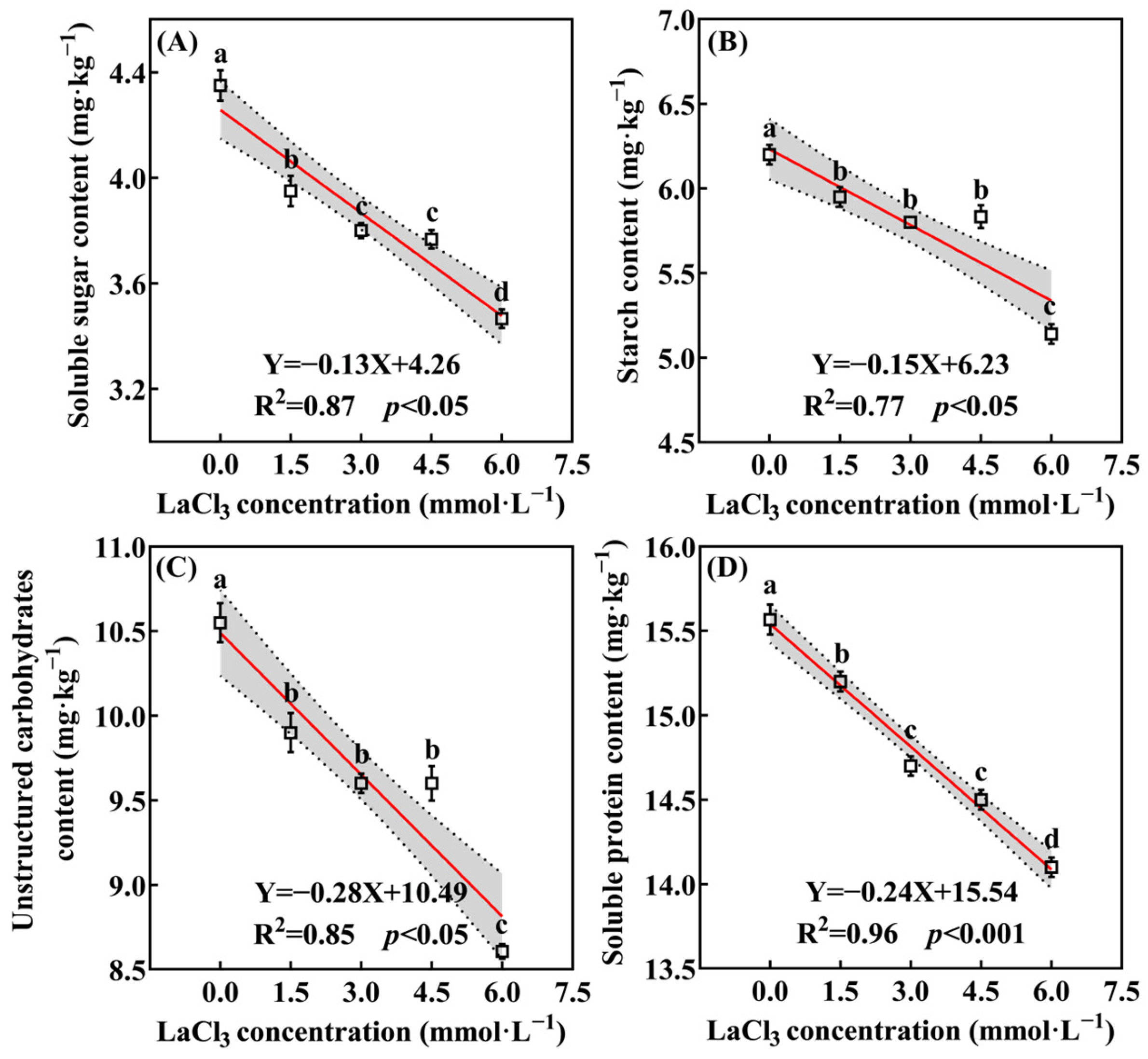 3.3.3. LaCl3 Inhibits the Accumulation of Photosynthate in the Leaves of Quercus acumosa Seedlings