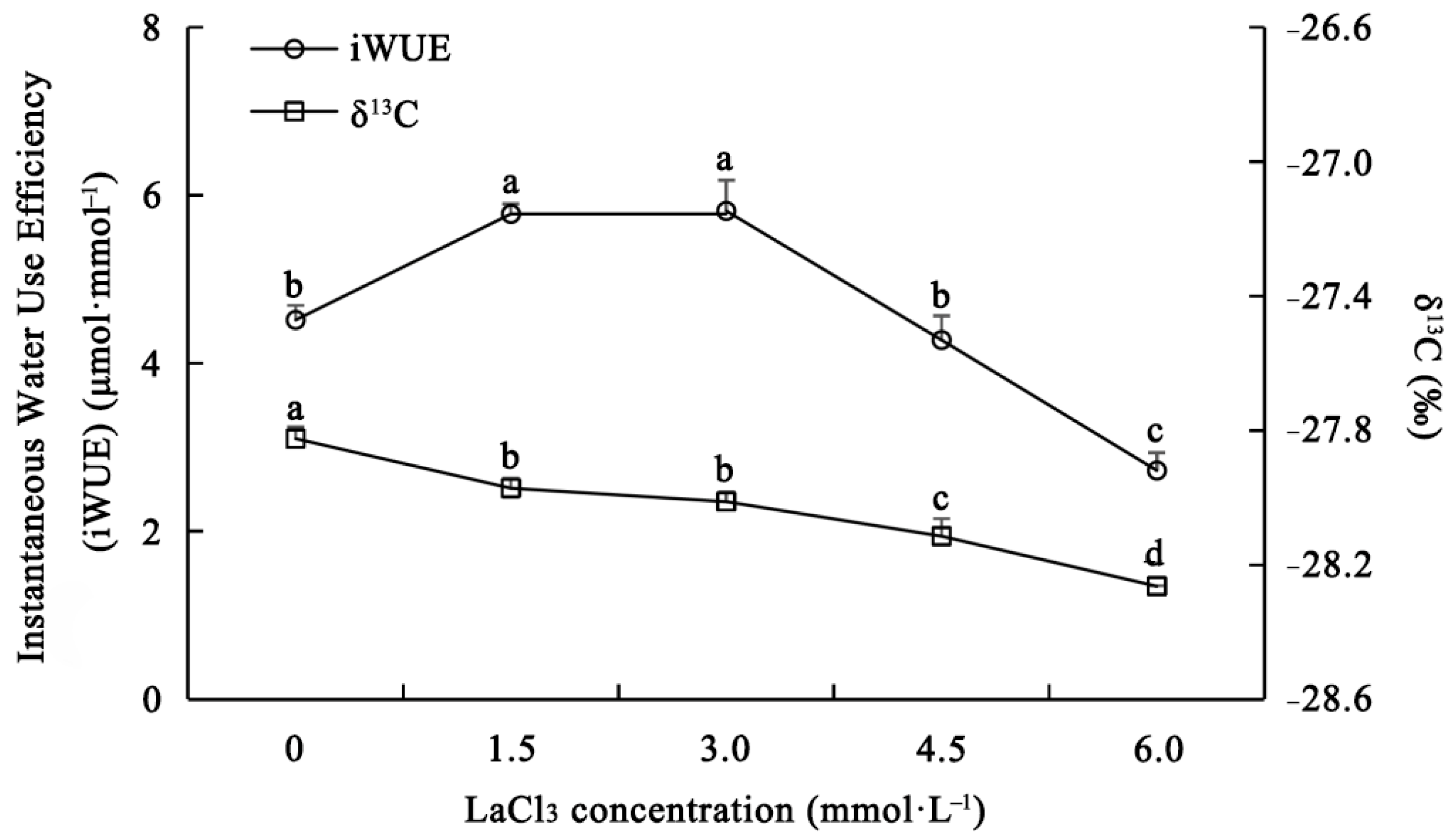 3.4. Effect of LaCl3 on the Water Use Efficiency of Quercus acutissima Seedlings
