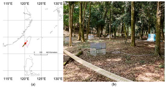 The Xiaping Botanical Garden Site (XP, 23°77′ N, 120°77′ E) was established in 1966 and was located in the Experimental Forest, National Taiwan University (EXFO, NTU), central Taiwan (Figure 1). This evergreen broadleaf forest is located at 155 m above sea level, with topography characterized by slopes averaging <5°. Tropical and subtropical plantation species were tested for tree growth over 55 years. The dominant tree species are Castanopsis indica, Alstonia scholaris, and Eucalyptus maculata, and the forest stand contained 365 stems ha−1, with trees averaging 26 ± 7 m in height and 26 ± 12 cm in DBH in 2021. The soil classification is Typic Dystrudepts, and the parent rock is composed of clastic sedimentary rocks after the Mesozoic. The soil water-holding capacity ranged from 312 to 423 mm/1.5 m [].