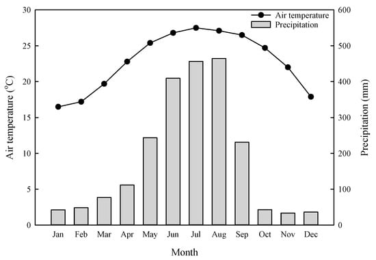 Litter accumulation at the site ranged from 2 to 6 cm in thickness, with annual litterfall production of 11 t ha−1 yr−1 in 2019 and 9 t ha−1 yr−1 in 2020. The soil profile is approximately 90–100 cm deep. The surface horizon (0–10 cm) is loam in texture and exhibits a low bulk density of 0.73 g cm−3 (Table 1). Soil organic matter content is provided in Table 1. According to the Chushan meteorological station, the 1995–2020 climatology shows a mean annual temperature (MAT) of 22.8 °C and an annual precipitation (MAP) averaging 2197 mm (Figure 2).