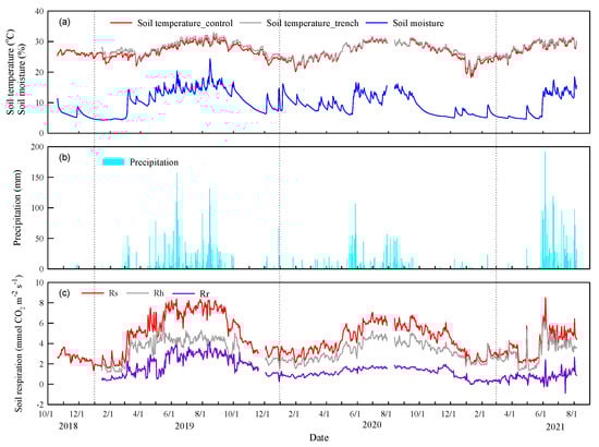 Daily variation in (a) soil temperature at 5 cm depth of soil, and soil moisture content at 10 cm depth of soil, (b) precipitation, and (c) soil respiration (Rs, soil respiration; Rh, heterotrophic respiration; Rr, autotrophic respiration). The vertical dashed line denotes the boundary between measurement years.