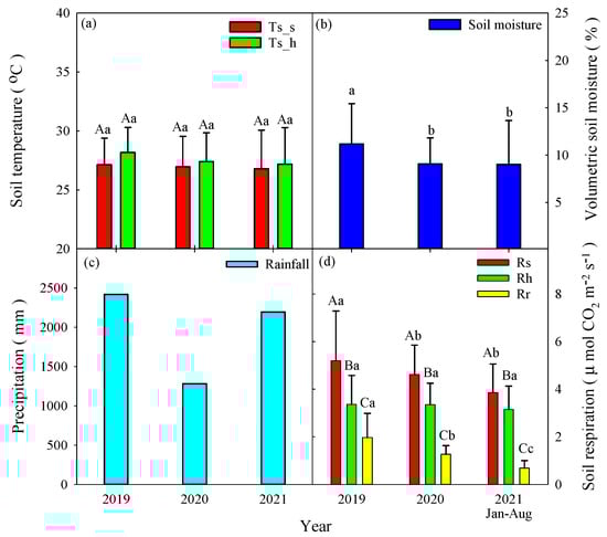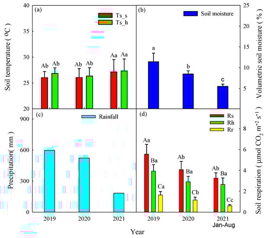 Mean annual values of (a) soil temperature, (b) soil moisture, and (c) annual precipitation and mean annual values of (d) soil respiration (Rs), heterotrophic respiration (Rh), and autotrophic respiration (Rr). The annual values in 2021 represented January to August results. Ts_s: soil temperature measured in chambers assigned to total soil respiration (Rs); Ts_h: soil temperature measured in root-exclusion chambers assigned to heterotrophic respiration (Rh). Different capital letters indicate differences among treatments within the same year at p < 0.05. Different lowercase letters indicate differences among years at p < 0.05.
