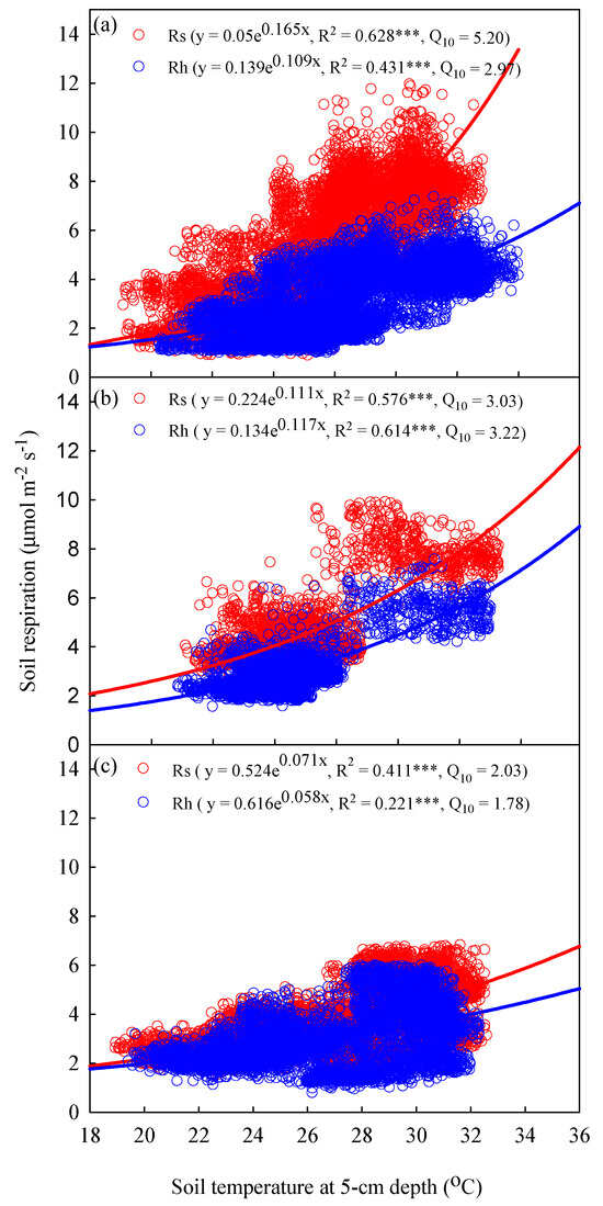 Relationships between half-hourly mean soil respiration (Rs, μmol CO2 m−2 s−1), heterotrophic respiration (Rh), and hourly soil temperature at 5 cm depth (°C) in (a) 2019, (b) 2020, and (c) 2021. The data represented January to August results in 2021. Asterisks indicate a significance: *** p < 0.001.