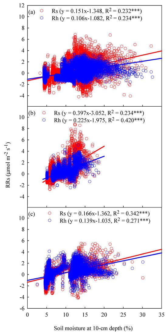 Relationships between half-hourly temperature normalized soil respiration (Rs, μmol CO2 m−2 s−1), heterotrophic respiration (Rh), and hourly soil moisture at 10 cm depth (%) in (a) 2019, (b) 2020, and (c) 2021. The data represented January to August results in 2021. Asterisks indicate a significance: *** p < 0.001.