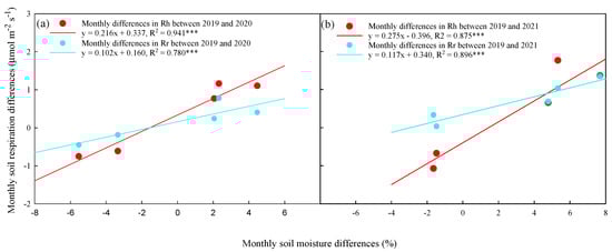 The relationships between the differences in monthly mean soil moistures and monthly mean Rh and Rr values in the non-growing season between 2019 and 2020 are shown in Figure 9. The differences in soil moisture significantly increased with the Rh differences (R2 = 0.941 in 2020, R2 = 0.875 in 2021, p < 0.001) (R2 = 0.780 in 2020, R2 = 0.896 in 2021, p < 0.001). On the other hand, the differences in soil moisture also increased with the Rr differences (R2 = 0.780 in 2020, R2 = 0.896 in 2021, p < 0.001). Although we examined the relationship between soil moisture and soil respiration during the growing season, the regression results showed very low explanatory power (R2 < 0.05) and were not statistically significant (p > 0.05). Therefore, only the non-growing season relationship is presented in Figure 9. This highlights a limitation of the present study, as the weak coupling observed during the growing season may reflect complex interactions between soil moisture, root activity, and microbial activity.