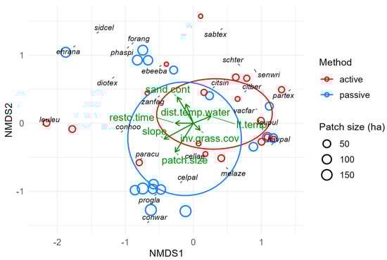 NMDS ordination depicting differences in canopy plant community composition. Each point represents one survey point (3 per study site; n = 36). Black text denotes canopy vegetation species and their associations with survey points and one another. Green vectors denote environmental gradients observed across survey points (only variables whose p < 0.1 are shown; see Table 1). Ellipses denote 95% confidence intervals around the theoretical average communities (centroids) for each restoration method (active vs. passive). Legend: sand.cont, soil sand content (%); dist.temp.water, distance to seasonally flooded water bodies (km); lt.temp, long-term temperature (30-year normals, °C); resto.time, time since restoration began (years); inv.grass.cov, ground cover by invasive grasses (%); slope, landscape steepness (°); patch.size, area of the restored thornforest patch (ha).
