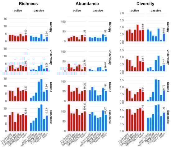 Bar plots showing the mean species richness, total plant abundance, and Shannon diversity index for all sites, broken down by forest layer (canopy, understory, and ground) and overall (ensemble), with sites grouped and colored based on the restoration method (red = active, blue = passive). The rightmost bar in each set represents the mean for that group and has a text label denoting the group’s mean value. Abundance was quantified as the percentage of ground covered by all species for the understory and ground layers and as the sum of dominance values for all species in the canopy layer.