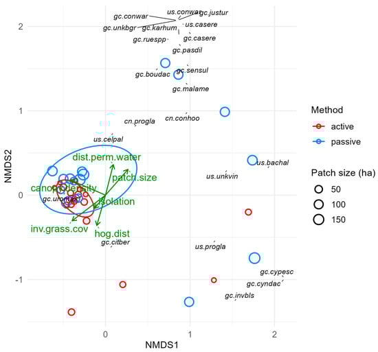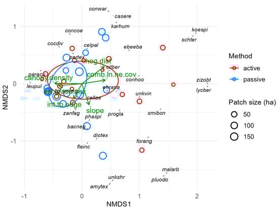 NMDS ordination depicting differences in understory plant community composition. Each point represents one survey point (3 per study site; n = 36). Black text denotes understory vegetation species and their associations with survey points and one another. Green vectors denote environmental gradients observed across survey points (if p < 0.1; see Table 1). Ellipses denote 95% confidence intervals around the centroids for each restoration method (active vs. passive). Legend: hog.dist, ground disturbance by hogs (%); comb.ln.ne.cov, natural log of the ratio of combined native plant cover (across forest strata) to combined exotic plant cover; canopy.density, mean number of canopy stems per hectare; inv.grass.cov, ground cover by invasive grasses (%); int.to.edge, ratio of the area of a restored thornforest patch (ha) to its perimeter (km); slope, landscape steepness (°).