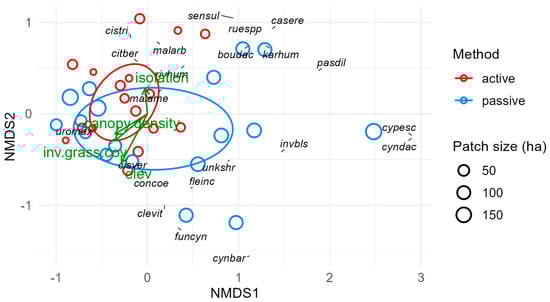 NMDS ordination depicting differences in ground layer plant community composition. Each point represents one survey point (3 per study site; n = 36). Black text denotes ground layer species and their associations with survey points and one another; only the 22 most influential species are shown. Green vectors denote environmental gradients observed across survey points (if p < 0.1; see Table 1). Ellipses denote 95% confidence intervals around the centroids for each restoration method (active vs. passive). Legend: isolation, the proportion of land within 1 km of the restored thornforest patch that is also thornforest (%); canopy.density, mean number of canopy stems per hectare; inv.grass.cov, ground cover by invasive grasses (%); elev, elevation above sea level (m).