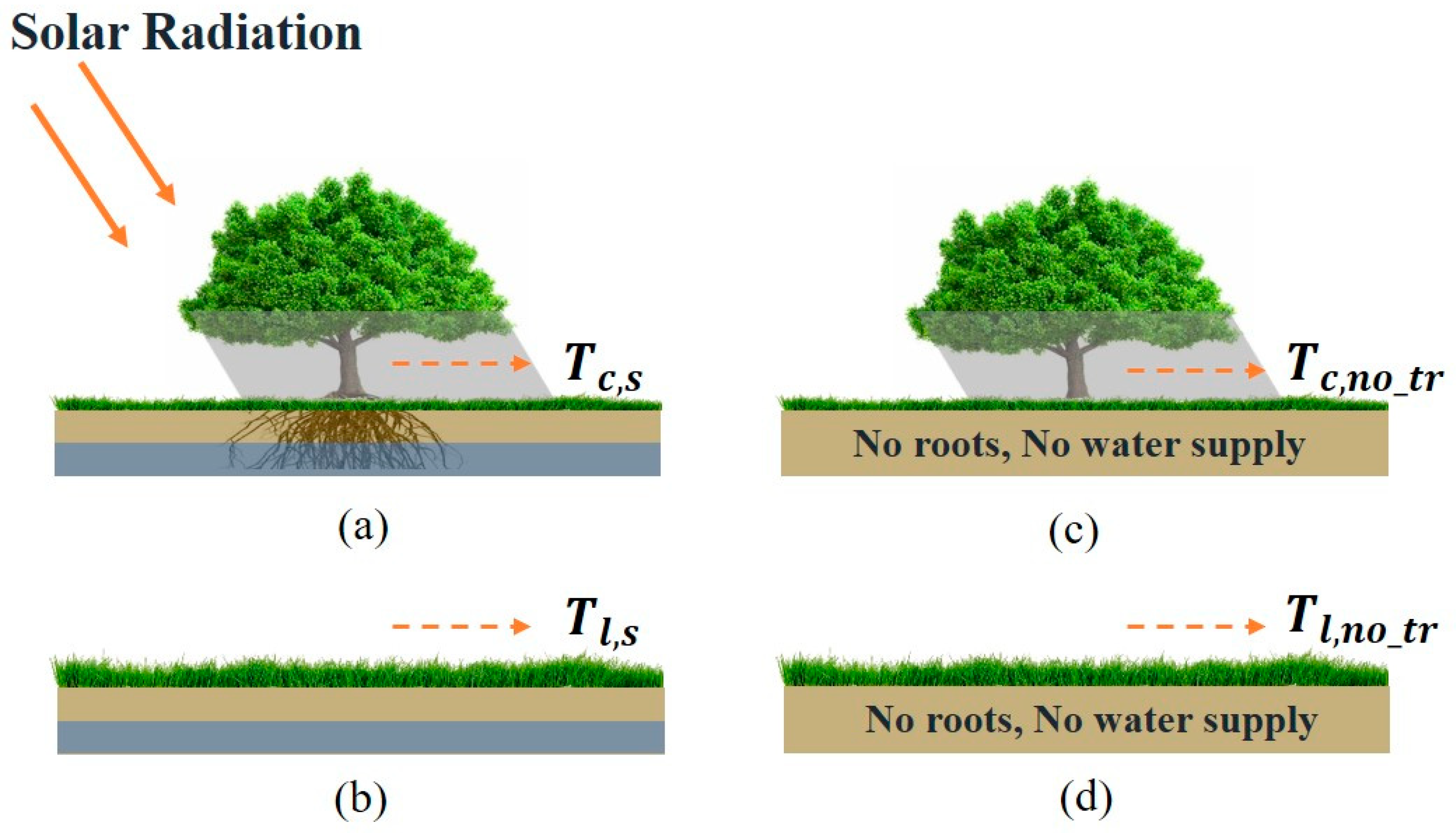 - Li, H.; Zhao, Y.; Wang, C.; Ürge-Vorsatz, D.; Carmeliet, J.; Bardhan, R. Cooling efficacy of trees across cities is determined by background climate, urban morphology, and tree trait. Commun. Earth Environ. 2024, 5, 754. [Google Scholar] [CrossRef]