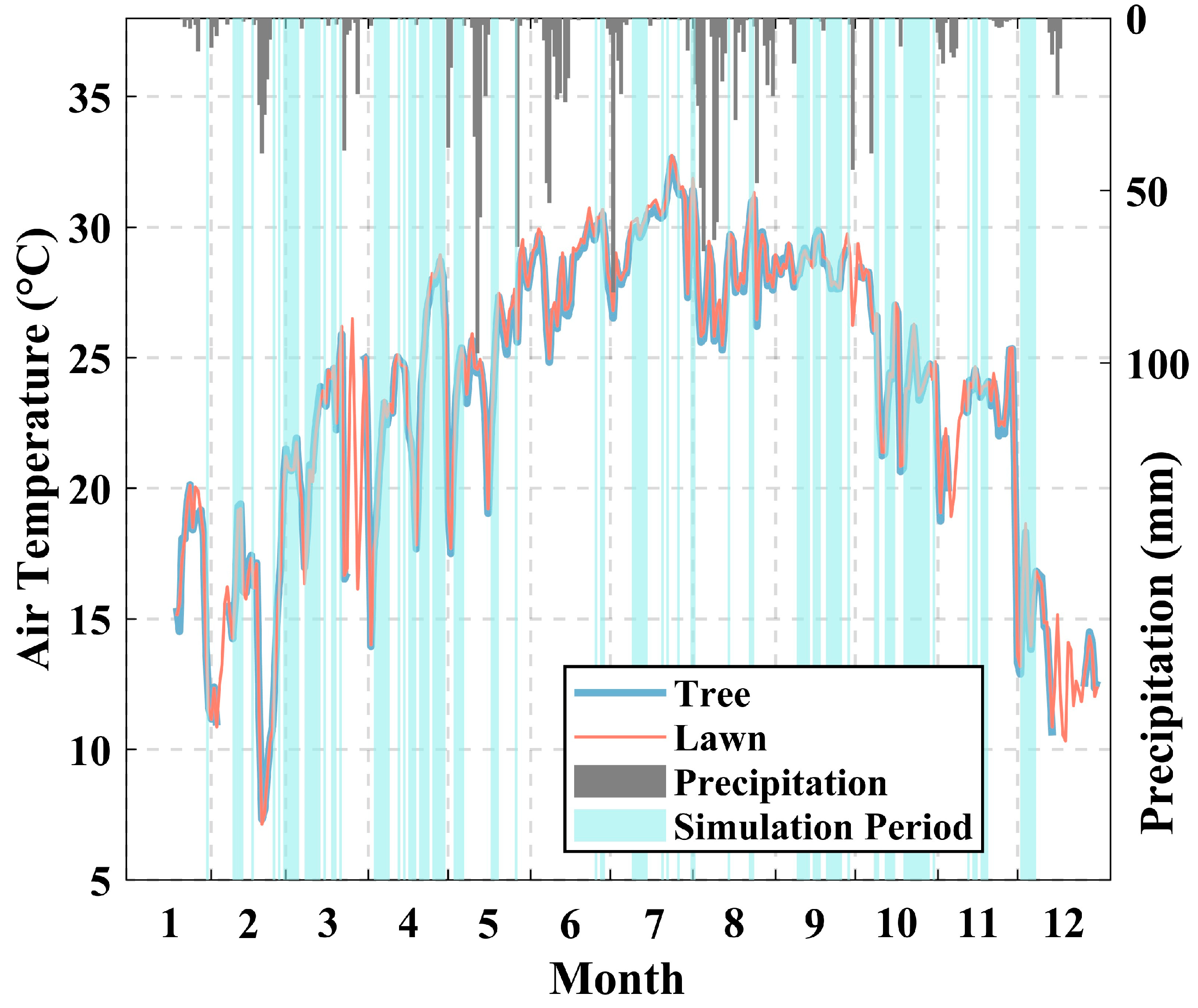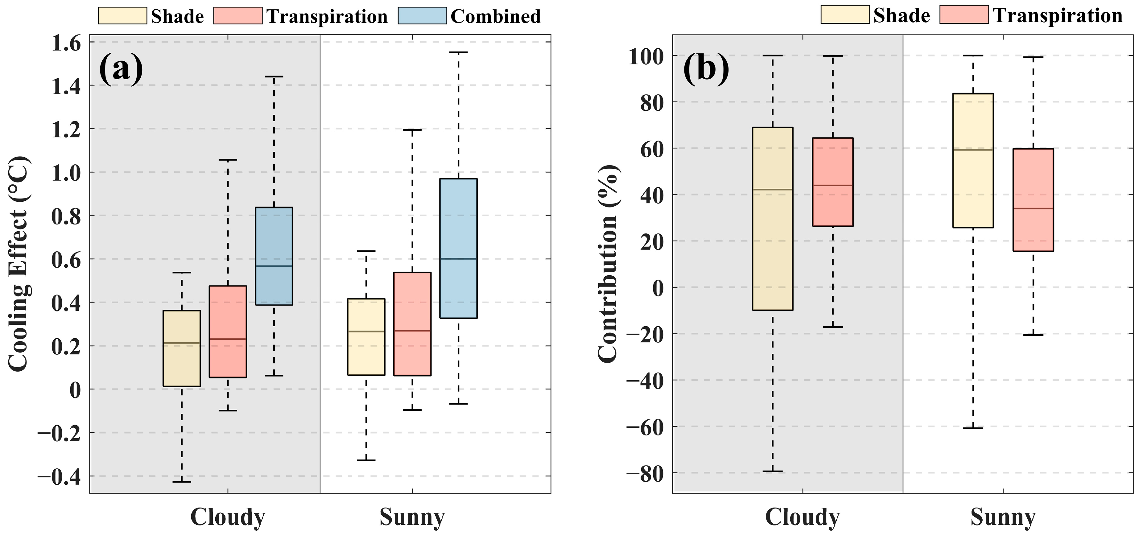 3.4. Respective Cooling Effects of Tree Transpiration and Canopy Shading