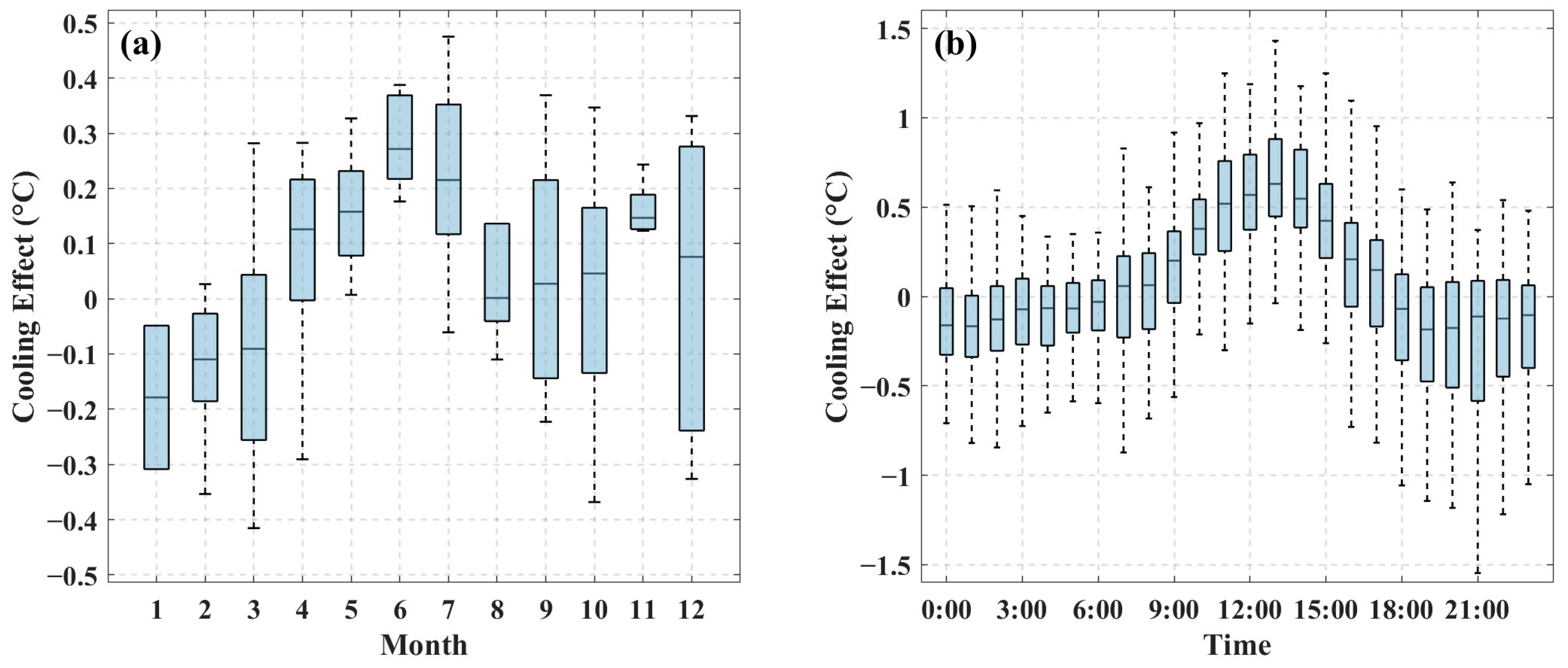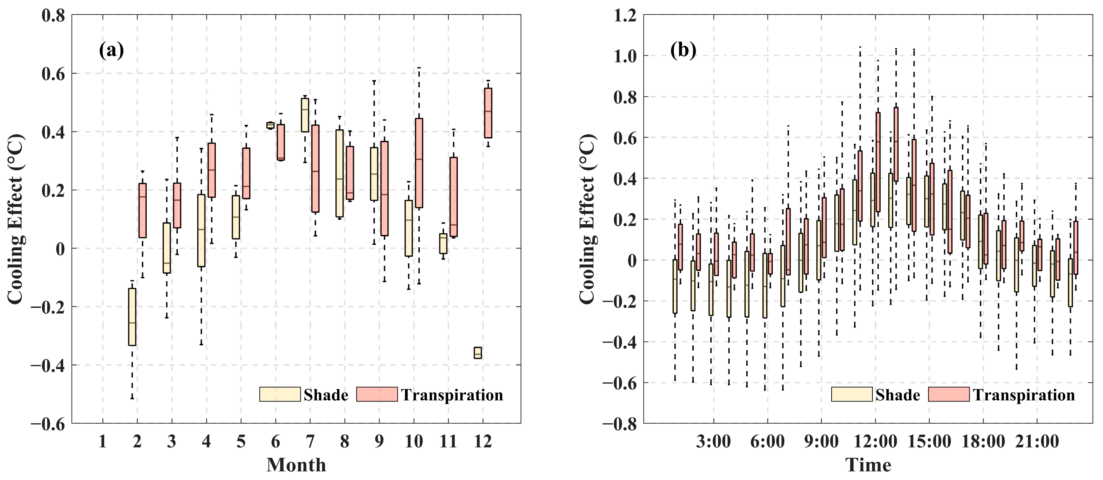 3.2. Characteristics of the Combined Cooling Effects of Tree Transpiration and Shading