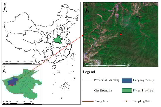The study was conducted in Longyuwan National Forest Park, located in Miaozi Town, southeastern Luanchuan County, Luoyang City, Henan Province, China. The Park is situated on the northern slope of the Funiu Mountains, part of the eastern section of the Qinling Mountain range (Figure 1). It is approximately 13.7 km in straight-line distance from the county seat. The geographic coordinates of the area span from 111°40′ to 111°49′ E and 33°39′ to 33°46′ N, with a total area of approximately 1840 hectares (ha) [25]. This region is characterized by a temperate continental climate, with a mean annual temperature of 12.4 °C. Winters are cold and dry, while summers are cool and humid with concentrated precipitation. The average annual precipitation ranges from 700 to 900 mm, annual evaporation reaches 1514.7 mm, and the mean annual relative humidity is approximately 68% [26]. The region exhibits pronounced water deficits driven by the strong annual evaporative demand associated with its temperate continental monsoon climate. Mid-montane and subalpine terrain further amplifies surface evapotranspiration, while precipitation is concentrated in July–September and remains scarce during other months, leaving atmospheric evaporative demand persistently unmet. In such water-limited settings, forest ecosystems—especially vegetation at high elevations and on steep slopes—recover and undergo succession more slowly once disturbed. Consequently, the ecological functions of water bodies are both especially important and markedly vulnerable.