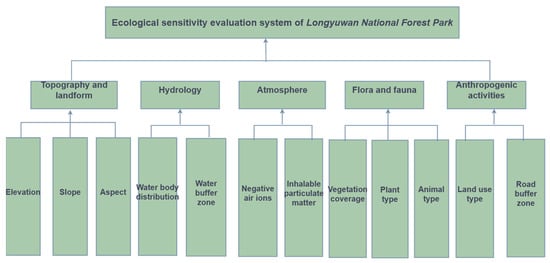 Target Layer (A): Ecological sensitivity evaluation of Longyuwan National Forest Park; System Layer (B): Comprising five subsystems—topography and geomorphology, hydrology, atmosphere, flora and fauna, and human activities; Indicator Layer (C): Consisting of 12 specific evaluation factors, including elevation, slope, aspect, and others (Figure 3).