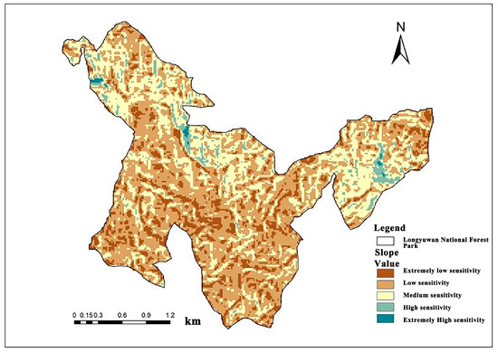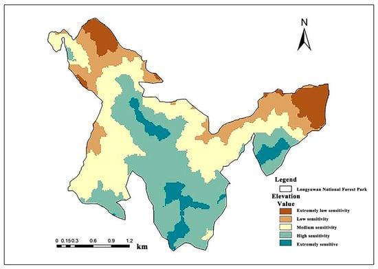 According to the analysis of the spatial data, the total area of Longyuwan National Forest Park is approximately 1840 ha. From the perspective of elevation, ecological sensitivity exhibits a spatial pattern that gradually increases from the northwest toward the central and southern parts of the park, followed by a gradual decrease toward the northeast. The main peak, Jijiaojian, located in the southeastern part of the park, represents the area with the highest ecological sensitivity. Regarding sensitivity classification, the extremely high sensitivity zone and high sensitivity zone account for 7.73% and 14.65% of the total park area, respectively. In contrast, the moderate and low sensitivity zones together comprise 70.50% of the area (Figure 4 and Table 3). Overall, the northeastern and northwestern regions of the park exhibit relatively low elevation-related ecological sensitivity, while the southern region demonstrates higher sensitivity levels.