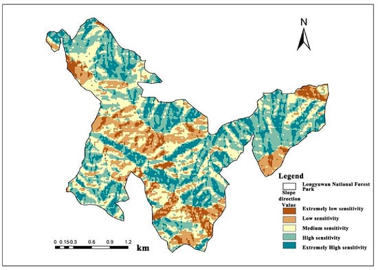 According to the analysis, the ecological sensitivity of Longyuwan National Forest Park with respect to aspect is relatively high. The areas classified as having moderate and high sensitivity account for 25.21% and 34.61% of the total park area, respectively (Table 5 and Figure 6). These Percentages are relatively large, suggesting that the suitability of slope aspect for biological habitats is generally suboptimal in these regions.