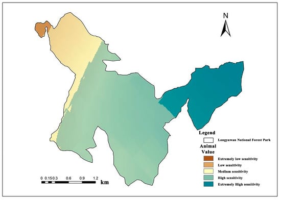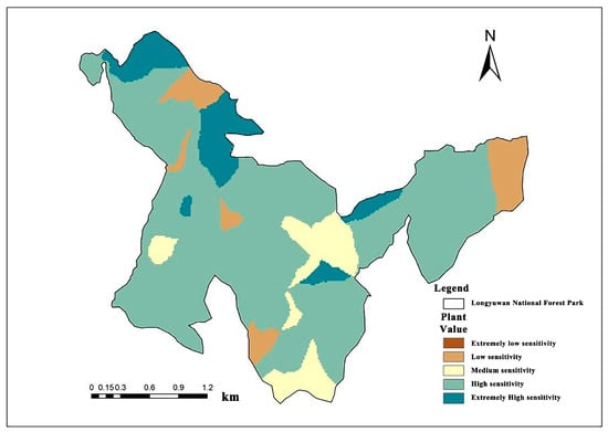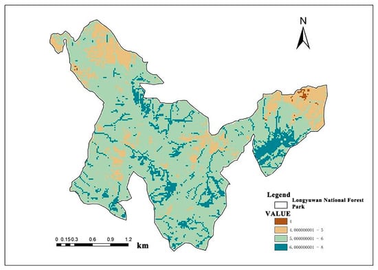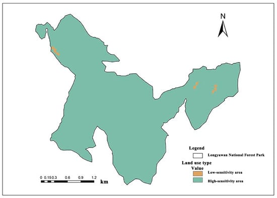According to the comprehensive ecological sensitivity evaluation map, the overall ecological sensitivity of Longyuwan National Forest Park exhibits a spatial pattern of being higher in the south and lower in the north. The areas with relatively high ecological sensitivity are primarily located in the southern forest zone, while regions in the northwest and northeast show lower sensitivity. Highly sensitive areas are concentrated in the central forest zone, the eastern forest zone, and the southern mountainous forest area, among which the central zone includes three relatively contiguous subregions of high sensitivity.