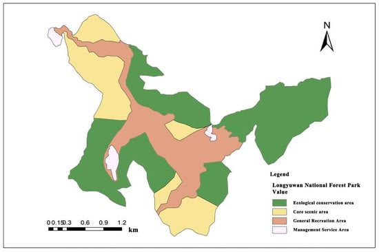 Based on the comprehensive ecological sensitivity assessment, the Longyuwan National Forest Park was zoned into functional areas according to the degree of ecological sensitivity. As the sensitivity levels presented in the form of spatial patches following classification by the natural break’s method, the resulting zones were scattered and lacked spatial continuity (Figure 16 and Table 15). Therefore, in order to improve spatial coherence, the sensitive areas were reorganized and integrated based on the ecological sensitivity classification map. The forest park was ultimately divided into four functional zones: Ecological Conservation Zone, Core Scenic Zone, General Recreation Zone, and Management and Service Zone [41].