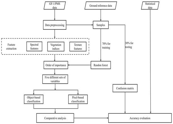 Based on GF-1/PMS remote sensing images during the overwintering period, spectral, vegetation index, and texture features were extracted in this study. According to the importance order of feature variables, five different sets of variables were formed. The pixel-based and object-based RF algorithm was used to map the planting area of flat peaches in the 143rd Regiment of Shihezi. Through statistical data and confusion matrix, the impact of different schemes on the classification results of flat peaches was analyzed, aiming to determine the most suitable classification method for the information extraction of flat peaches. The main research ideas of this study are shown in Figure 1.