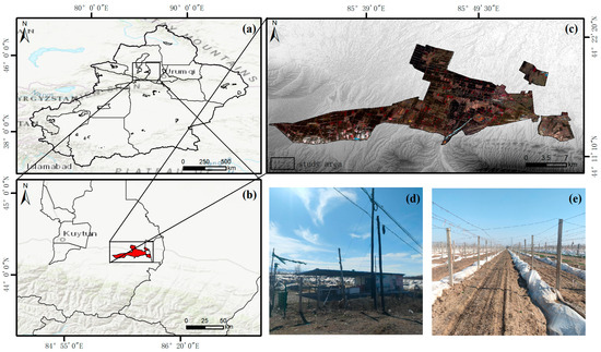 (a,b) The location of the study area in Xinjiang; (c) GF-1 false color image of the study area; (d) flat peaches during the overwintering period; (e) grapes during the overwintering period.