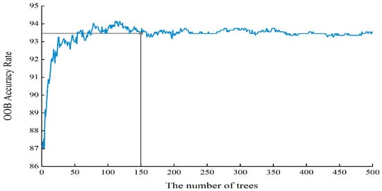 The Random Forest (RF) algorithm, proposed by Breiman in 2001, is an ensemble machine learning algorithm based on decision trees [47]. It is widely used in crop classification and land cover mapping [36,48,49]. The final prediction result of Random Forest is determined by majority voting from multiple independent decision trees. During the model training process, the interference of outliers and noise is effectively reduced by using the Bagging (Bootstrap Aggregating) algorithm, and it has good processing capability for high-dimensional data. The higher the accuracy of the random forest model, the higher the mapping accuracy of the flat peach. In the RF model construction process, two parameters need to be adjusted, namely the number of decision trees () and the number of features considered when splitting nodes in each tree (). In this study, is set to the square root of the total number of input features [38]. 45 feature variables of GF-1 image data were input, with set to 6. Out-of-bag samples (OOB, samples not selected when constructing a single decision tree) account for approximately 1/3 of all training data. By calculating the OOB error (, the difference between the observed and predicted values of out-of-bag data), the model performance and the importance of feature variables can be evaluated. To evaluate the impact of the parameter on classification accuracy, the out-of-bag accuracy was tested for ranging from 0 to 500. As shown in Figure 3, the OOB accuracy increases with the increase of , and stabilizes when exceeds 150. When the number of trees approaches 500, the model’s accuracy difference is within 1%. Considering the computational time cost of RF, this study sets to 150.
