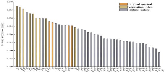 The combination of multiple feature variables is an effective means to improve the classification accuracy of remote sensing images. This study used 45 feature variables, including original bands, vegetation indices, and texture features, for model training. The original bands are the average spectral reflectance of four bands: Blue, Green, Red, and NIR. The vegetation indices include nine indices: Simple Ratio Index (SRI) [17], Green Vegetation Index (VIgreen) [17], Normalized Difference Vegetative Index (NDVI) [36], Renormalized Difference Vegetation Index (RDVI) [17], Modified Simple Ratio (MSR) [44], Soil Adjusted Vegetation Index (SAVI) [45], Difference Vegetation Index (DVI) [35], Enhanced Vegetation Index (EVI) [6], and Red Green Ratio Index (RG) [46]. In high spatial resolution images, the texture information of different objects is particularly evident. The texture features used in this study are based on the Gray-Level Co-occurrence Matrix (GLCM) and include eight texture statistics: Mean, Variance, Entropy, Angular Second Moment, Homogeneity, Contrast, Dissimilarity, and Correlation. The calculation formulas for the feature variables are shown in Table 3.