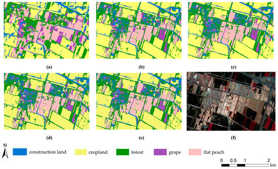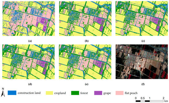 As shown in Figure 5 and Figure 6, the distribution of land cover types divided by the two classification methods was roughly the same, with cropland showing a blocky distribution, while flat peaches, grapes, forest, and construction land exhibit an interleaved distribution. As the number of features increases, the overall classification results of Schemes 2–5 (Figure 5b–e and Figure 6b–e) did not change significantly. However, from Scheme 1 (Figure 5a and Figure 6a) to Scheme 2 (Figure 5b and Figure 6b), it can be observed that the classification effectiveness of various land cover types had greatly improved, indicating that adding 4 vegetation indices, 4 texture features, and 2 original bands on the basis of RG, VIgreen, SRI, B1_Var, and EVI was very useful for improving the classification accuracy of various land cover types. By comparing the classification results of the two methods, it was found that the pixel-based extraction results are more fragmented, and flat peaches were severely confused with forest, buildings, and grapes. On the other hand, the object-based classification method can effectively avoid the ‘Salt and pepper noise’, and the extraction results of flat peach plots were more complete, although there was still some misclassification between grapes, flat peaches, forest, and buildings. Visually, the object-based classification method was superior to the pixel-based method, indicating that the object-based classification method outperformed the pixel-based method in the extraction of flat peach planting areas from high-resolution images, providing better classification results.