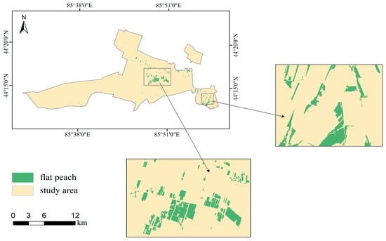 The flat peach, originally from Xinjiang, China [1], was introduced and cultivated in Japan, Europe, and America in the 17th century [2]. It plays a very important role in temperate rural economic development [3]. Benefiting from its unique natural environment, Xinjiang’s flat peaches are renowned both domestically and internationally for their delicious taste and fine texture [4]. In October 2000, the 143rd Regiment of Shihezi City, the largest flat peach planting base in Xinjiang, was officially named ‘The Hometown of Chinese Flat Peaches’ by the China Specialty Agricultural Products Committee. Currently, the flat peach industry has become a distinctive sector of the regiment and an important source of income for growers [5]. Although information on flat peach cultivation is of great practical importance, existing data is limited to statistical data, and there has been no research on the spatial distribution of flat peaches. Therefore, an approach based on the overwintering period for mapping flat peaches was developed in this study, aiming to improve the refined and intelligent management of flat peaches.