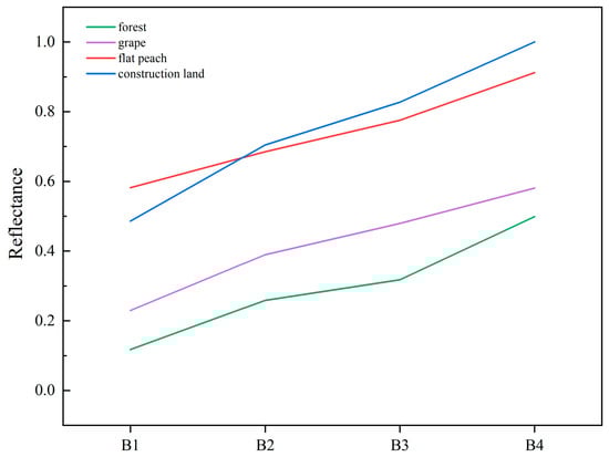 The average spectral curves of flat peaches, grapes, construction lands, and forests.