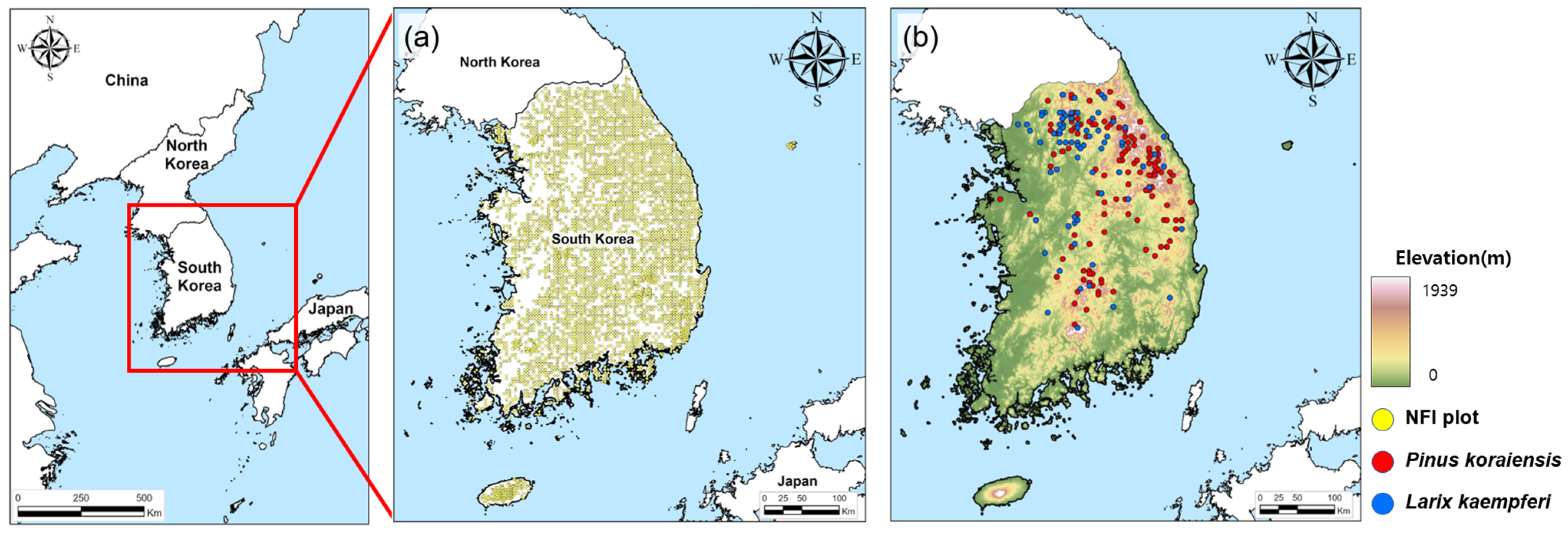 - National Institute of Forest Science (NIFoS). 2023 Tree Volume, Biomass, and Stand Yield Table (Research Report No. 1092); National Institute of Forest Science: Seoul, Republic of Korea, 2023. [Google Scholar]
