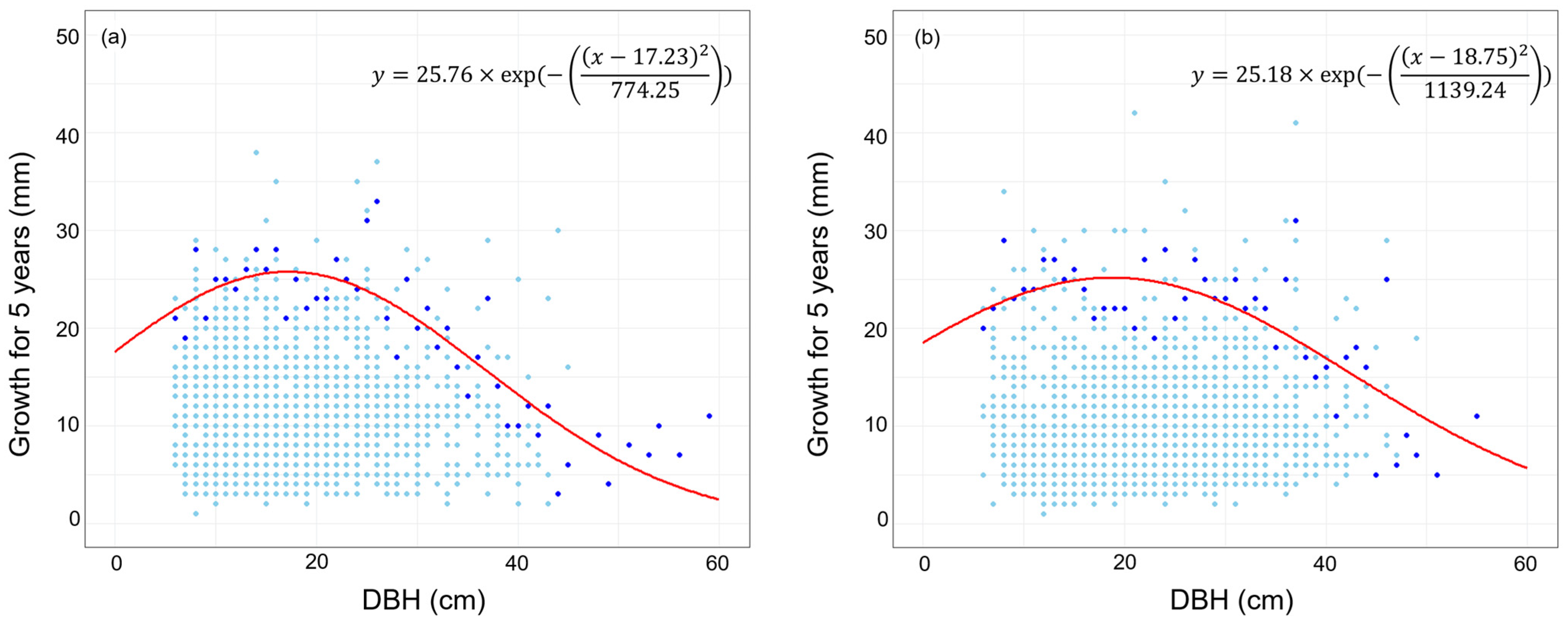 - Plots with missing individual tree data owing to survey omissions (including cases where dead trees were identified), which resulted in decreased total DBH and hindered the confirmation of accurate growth.